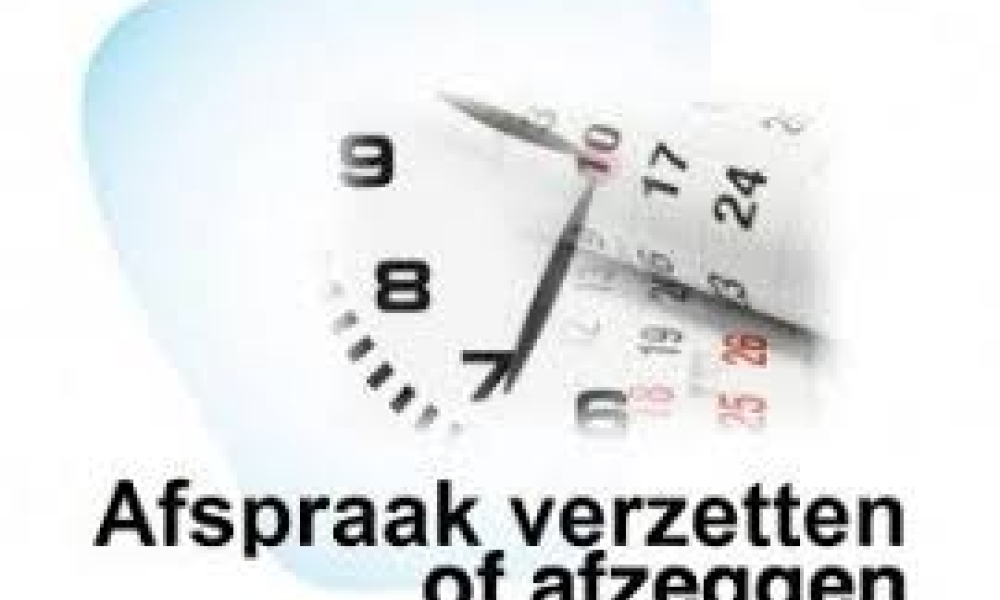 Als u de afspraak niet door kunt laten gaan, vragen wij u vriendelijk 24 uur van tevoren de afspraak af te bellen. Een andere patiënt kan dan in uw plaats ingepland worden.